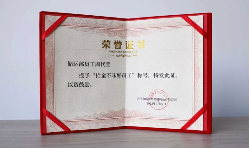 弘扬传统美德,树立时代新风,拾金不昧的行为虽然普通,但却充满了正能量。让人们感受到美德的可贵。天津市瑞丰达金属制品有限公司注重员工精神文明建设,大力弘扬中华传统文化及美德,学习先进典型,用榜样的力量深入引导员工将文明道德与职业操守紧密结合,切实的做到内化于心、外表于行。
