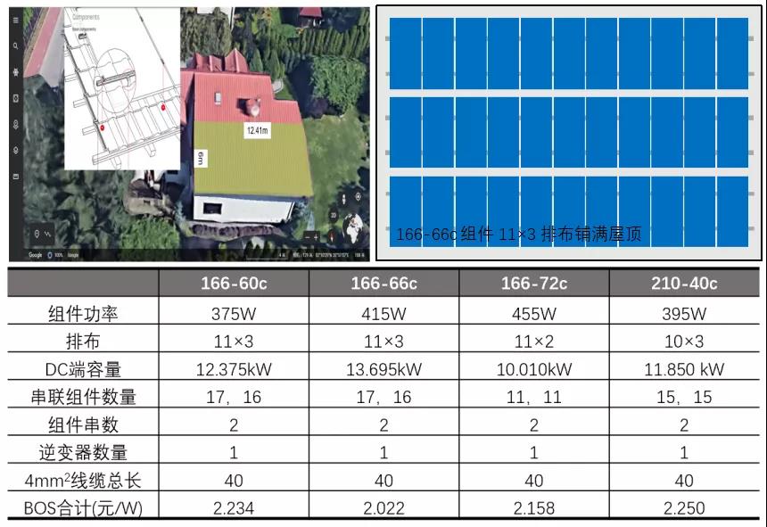 166的60c、66c组件可实现竖装11×3排布,166-72c组件无法排满3排,210-40c组件则只能排10列(10×3)。这种情况下,166-66c组件的总安装容量最高,对应的BOS成本也就最节省。